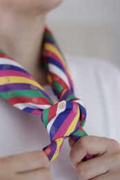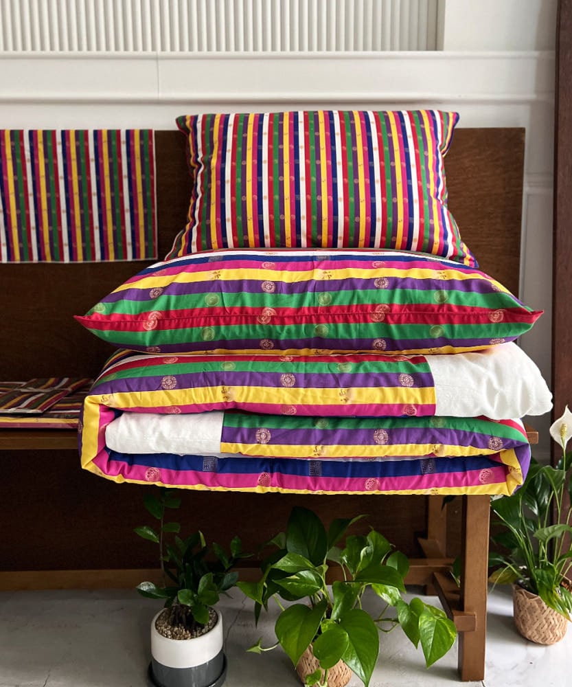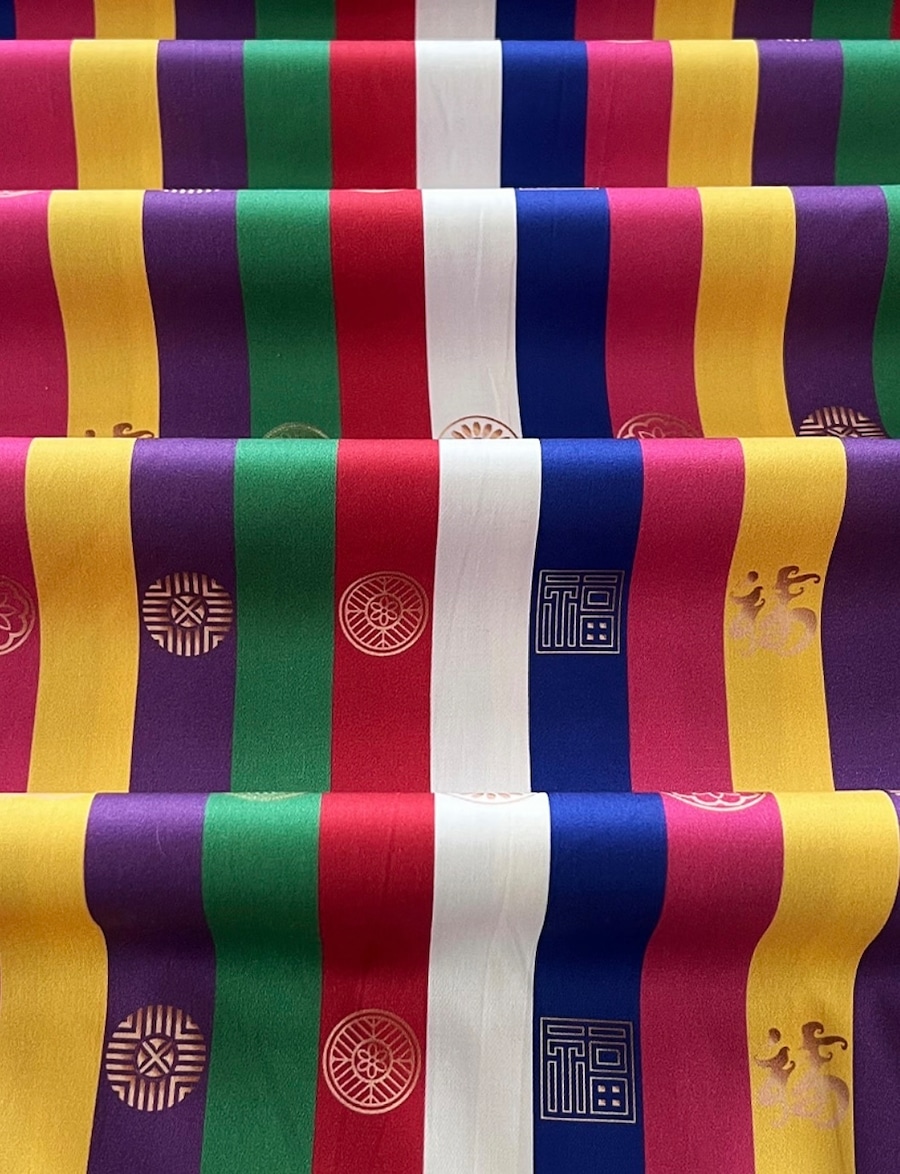 赤・青・黄・白・黒の五方色を基調としたストライプ模様が特徴です。