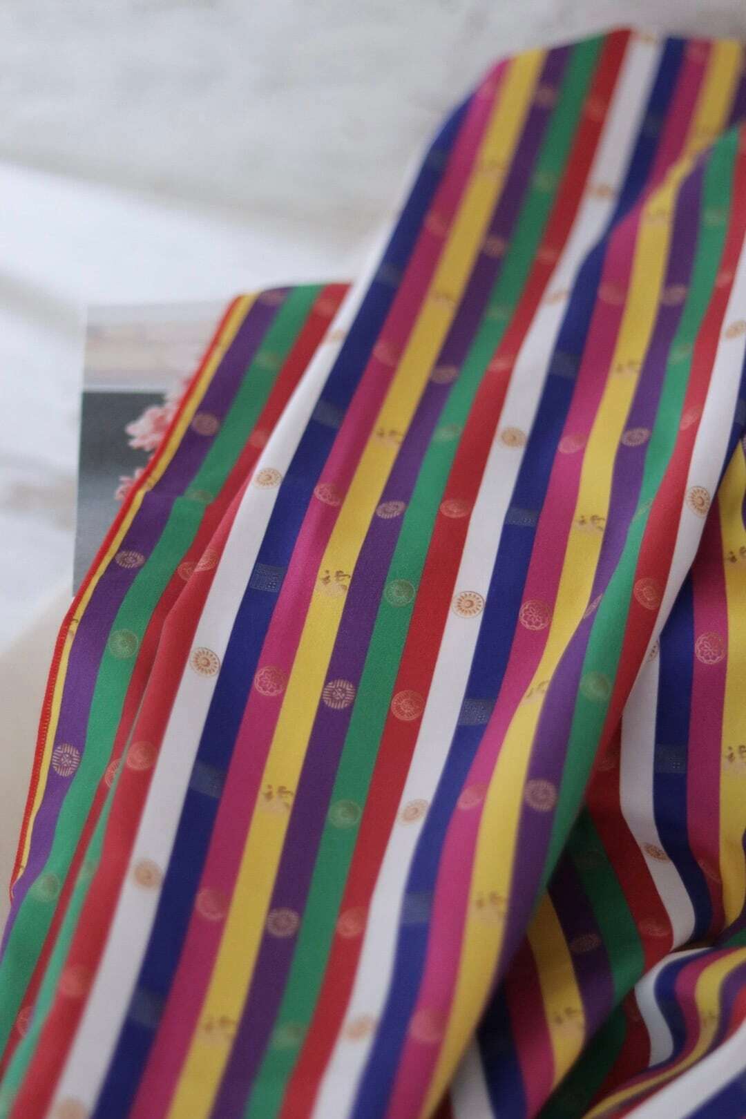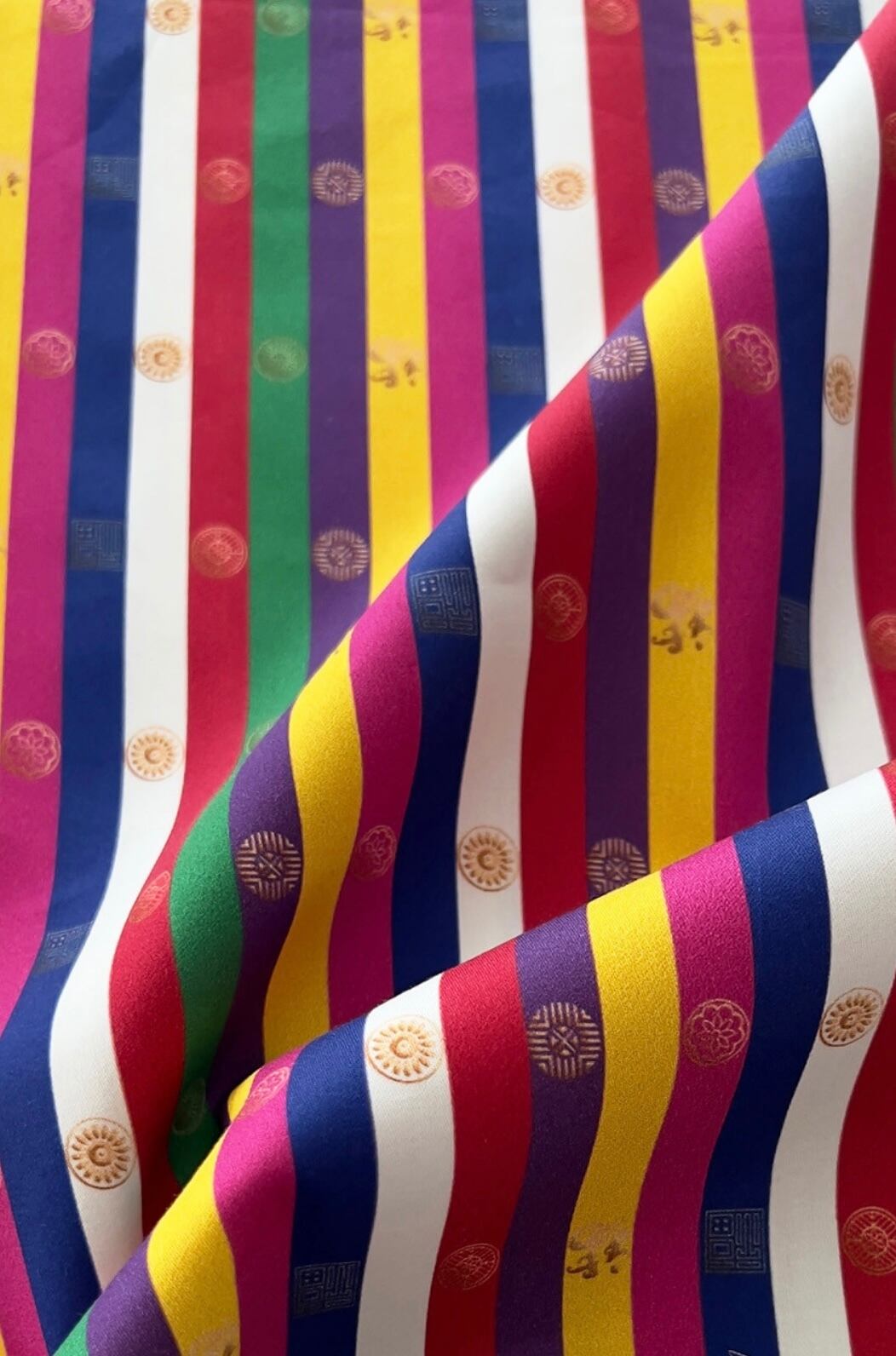 赤・青・黄・白・黒の五方色を基調としたストライプ模様が特徴です。